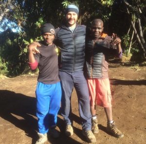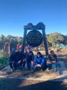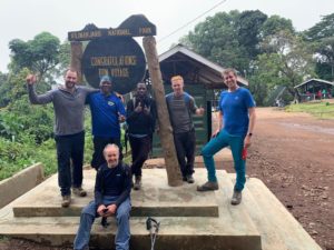 All good things must come to an end. We woke up one final time in our now smelly surroundings. 8 days of no shower and reusing worn clothes had taken its toll. We stepped out of our unhygienic living conditions into similar glorious weather with which we had previously been blessed. A slight coldness was felt as we breathed under warming blue skies. The sun was shining and so were we! Smiles that couldn’t be wiped or washed off our faces as we woke from our well-earned slumber. We traced our steps back to the entrance to the camp to get that customary photo under the sign. It was time for our final meal – our chef Saidi had delivered excellent food throughout. Kabila the ever-reliable porter delivered our food, his limited English able to describe what we were about to eat. Normally, our daily routine would be getting our bags out and preparing for the long walk ahead. Today was different, we got our bags out, but were then walked over to a clearing in the trees. Here our 16 helpers came together to sing and dance and wish us on our way. Some of us joined in with the celebration while others observed. We said our thanks and after many high fives, hugs and pictures we got ourselves together for one final walk. A short 3 hour stroll from Mweka camp to the Mweka gate. The adopted member of our group, Mike, was more like walking spaghetti by now – shoe problems – but he was a member of our team, so we supported him just like he supported us up the mountain. For the three musketeers the promise of a bar was too much as we wanted to run down the remaining part of the mountain.