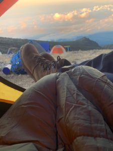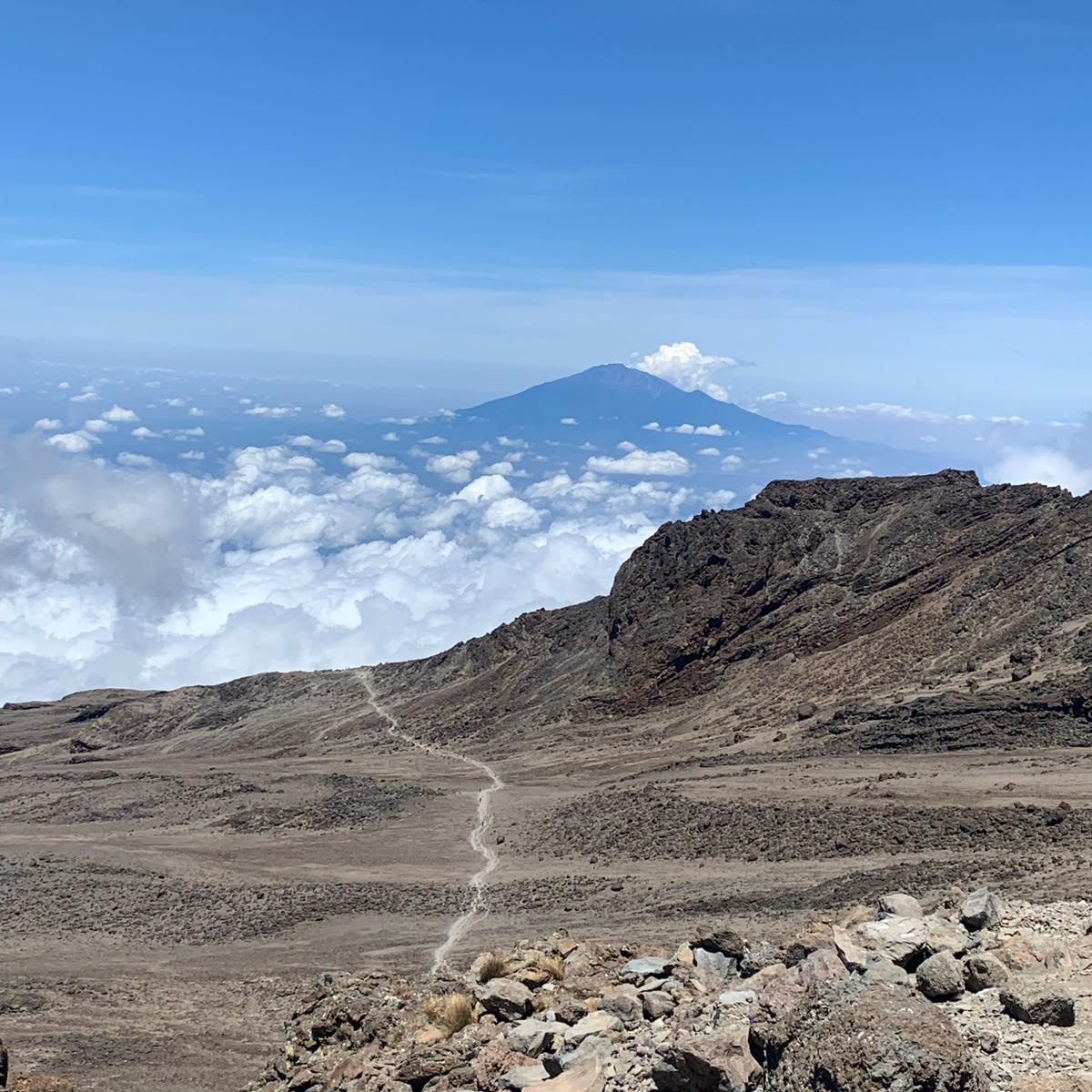 We were so lucky on this day, all alone and blessed with glorious sunshine, all those that we had seen the day before bombing onto the next camp as they wanted to reach the summit a little quicker. More fools them. How grateful I was and perhaps others too that we had that extra day to climb. I have mentioned before how that I am normally in a rush to see so much of one place when I travel. Thankfully this time the mountain was showing me everything it could as I took my time. Lessons to be learnt here perhaps. We indulged in the salubrious surroundings and some took full advantage with their cameras. We eventually arrived at the camp uplifted by what we had witnessed. Our camp was small this evening, with I think only 15 or so people. The older members of our group took some time to rest before the customary yet friendly rivalry over cards. I couldn’t sleep so found a perfect spot on the edge of a rock and sat and soaked up the view whilst trying to read a book. I soon couldn’t read as I was distracted by the incredible view. Words can’t describe how amazing the view was, to the left of my viewpoint I could see the white sea (a phrase used for describing the large number of clouds as one sat above them), to the right I could see the terrain we had covered getting here and behind me stood the monster mountain. I was eventually joined by my dear friend, Sam, and we sat and discussed the world in which we live. 3 days in and I asked as to what on earth we were going to go home to. We were completely disconnected from the cyber world. This wasn’t a fantasy world and we experienced a dose of reality. We decided to explore the camp and came across a couple of our helpers. Two lovely gentleman who would do anything for you out of kindness and probably for very little money. Their smiles so endearing. Conversation was difficult, language barriers and all that, and I wish we could have interacted more with these incredible members of our group. I will never forget Andrew and Nordin. So, we left our new found friends and made our way back to the main tent just as the others awoke in anticipation of an evening of cards as the sun set on perhaps the best day of the trip.