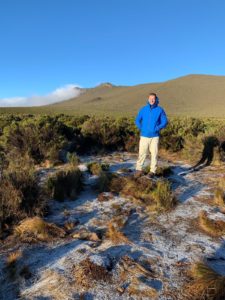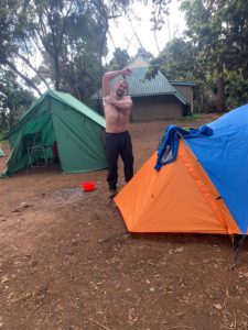 We went back to the welcome sign to get our regulation sign-in picture before setting off back down and round the mountain towards our evening camp. As we started our descent from Lava tower the cold had crept in and meant that we needed to wrap up warm. By the time we reached evening most of these extra layers had been peeled off. This was a downward stretch to the camp as we had gone up for an acclimatisation meal only and were going to spend the next 2 days climbing back up to the same height. As we approached our camp, it was carefully pointed out to us what the start of the next day’s route was. I didn’t think much of it, but it did look pretty steep. Others in the group were a little more concerned, and perhaps hiding fears they had. Our route to camp had become more appealing as there was more vegetation and trees and water seemed to make the landscape more beautiful than that to which we had become accustomed. Arrival into camp meant signing in, before ensuring we got a group photo and finding our tents. We weren’t pleased to see a group of 25 tents next to us, expecting a noise that would disrupt our evening. Thankfully their late arrival wasn’t noticed, their probably shorter route clearly taking its toll, they must have clambered into their tents exhausted and we barely heard anything from them. An evening of cards pursued before our newly accustomed early night for sleep.