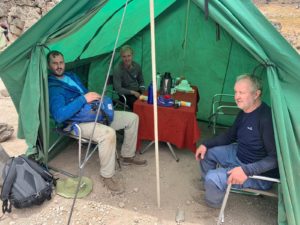 We were awakened by the ever reliable porter. So, we started to layer up. Our advice for going up was to wear a minimum of 5 layers to prepare for the cold and to cover our water bottles in a sock to ensure that our water didn’t freeze. By now all clothes packed had been worn so a rather dirty and smelling sock was used to provide much needed insulation for the water bottles. Hygiene of a different kind. We convened in the main tent for the final prep, a cup of soup was drunk, coats were zipped up, gloves were put on and headlights were turned on.