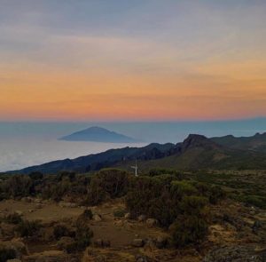 At the summit of our climb we weren’t blessed with good weather. The clouds had constantly swept in which was amazing to watch. So, we left the cloudy ridge summit, and were soon heading back down again. Surely, we were meant to be going up the mountain and not down, but the climb was a succession of ridges? We followed a rough rocky path to our night camp. Some people were amused to see a helipad, I was not that interested. Just wanted to get out of my sweaty clothes. Here we got our first view of Uhuru (what everyone believes to be Mt Kilimanjaro) still covered in cloud and looking a million miles away. Customary sign in process and mandatory photo before an evening playing cards was enjoyed.