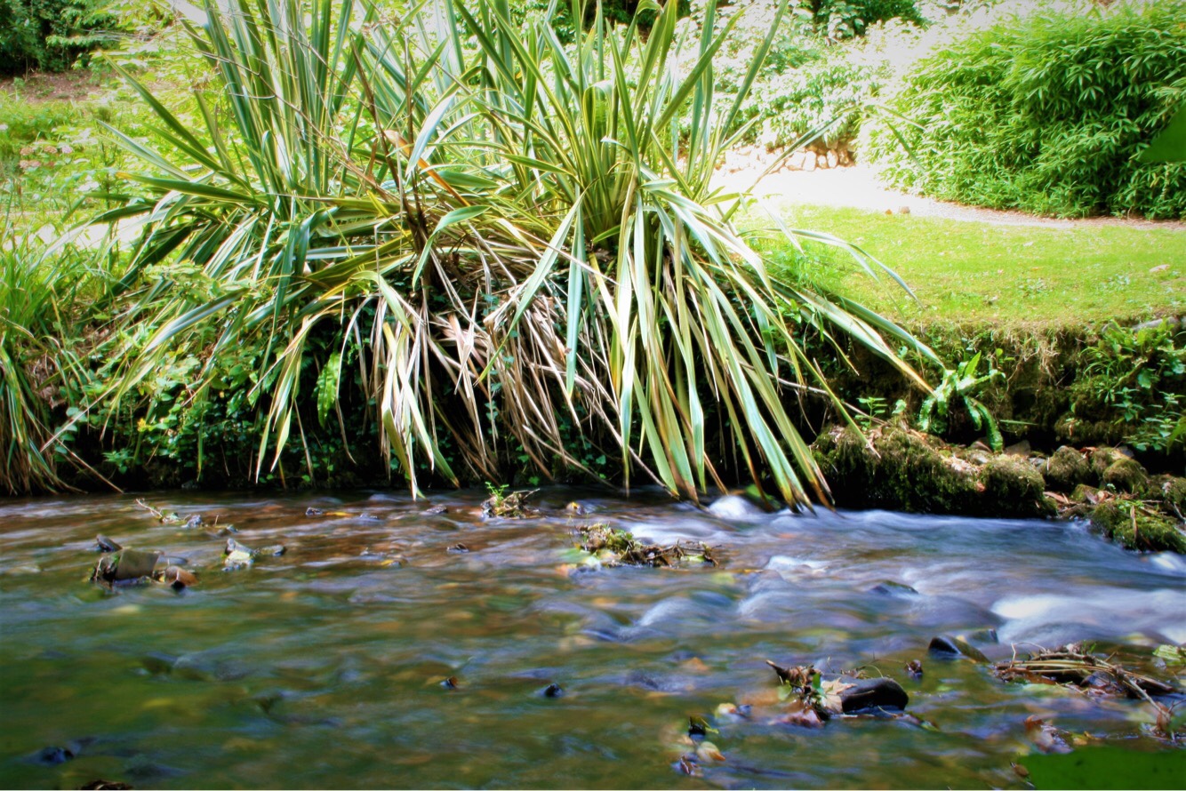 Remember our first view of Dunster Castle, where an exotic and diverse view of greenery almost camouflages the castle! One imagines that this was not always the case, as we learnt about the castle’s strategic importance. Flourishing flowers and green trees would have been the last thing on a garrison’s mind. It was during the Luttrell family occupancy that the castle became a family home, and changes were also made to the gardens. The castle’s location perched on top of a tor means that the gardens are steep. Different Luttrells have added their splash of creativity to the gardens as fashion and trends have changed through the centuries. It was in the 19th and 20th century that the garden really took the form that we see today as George Luttrell built an impressive Victorian garden full of terraces and colorful borders. But it was Alys Luttrell, an avid gardener and plant collector, who transformed the Victorian garden into a subtropical haven. Dunster’s climate provides the opportunity to thrive! Meandering along the eastern edge of the castle grounds is the river Avill.