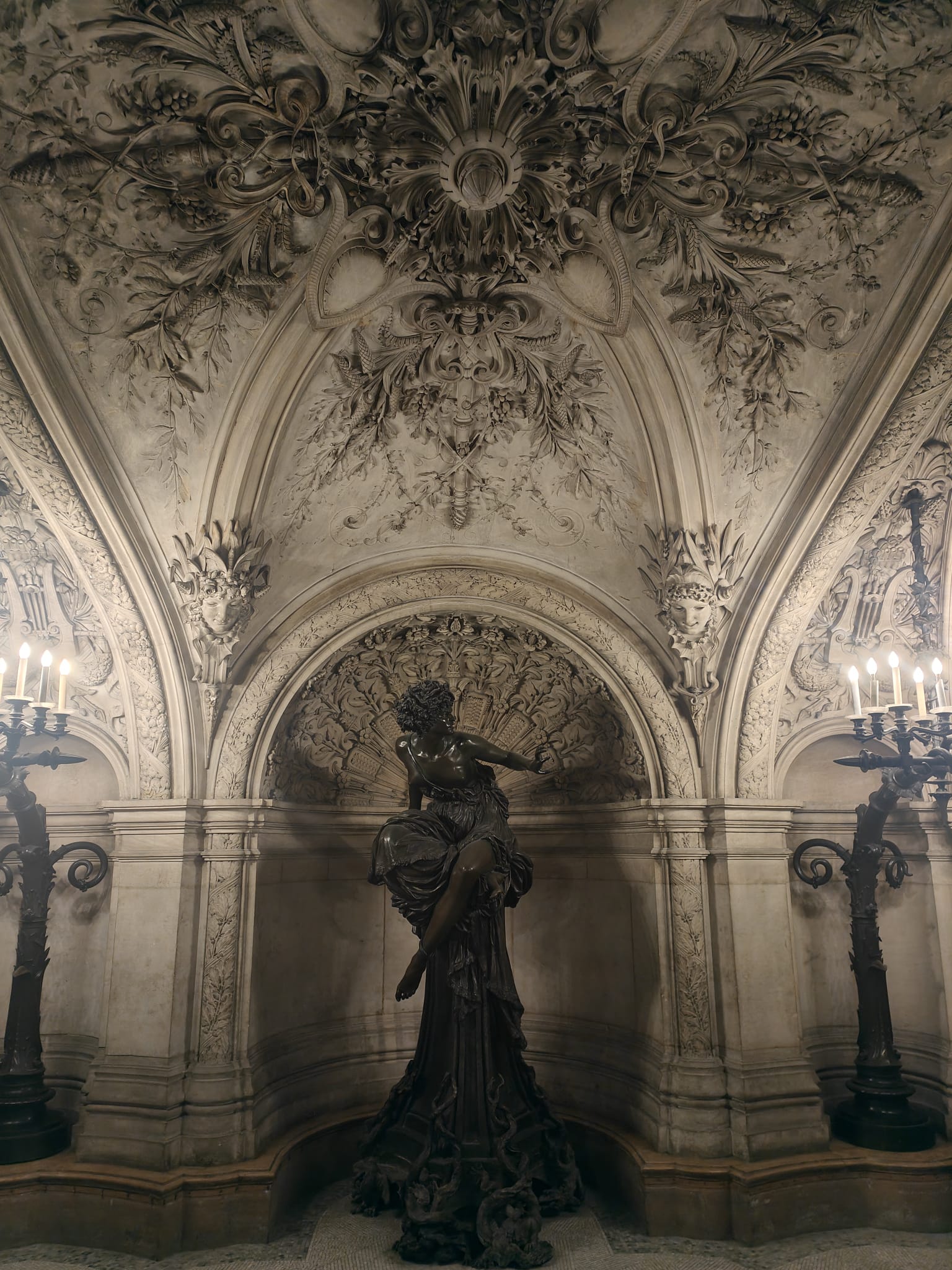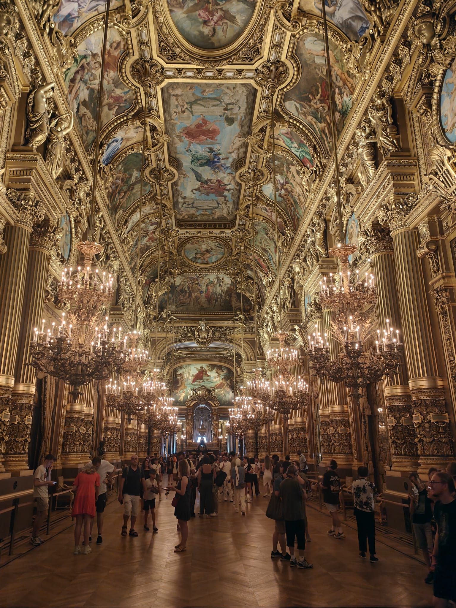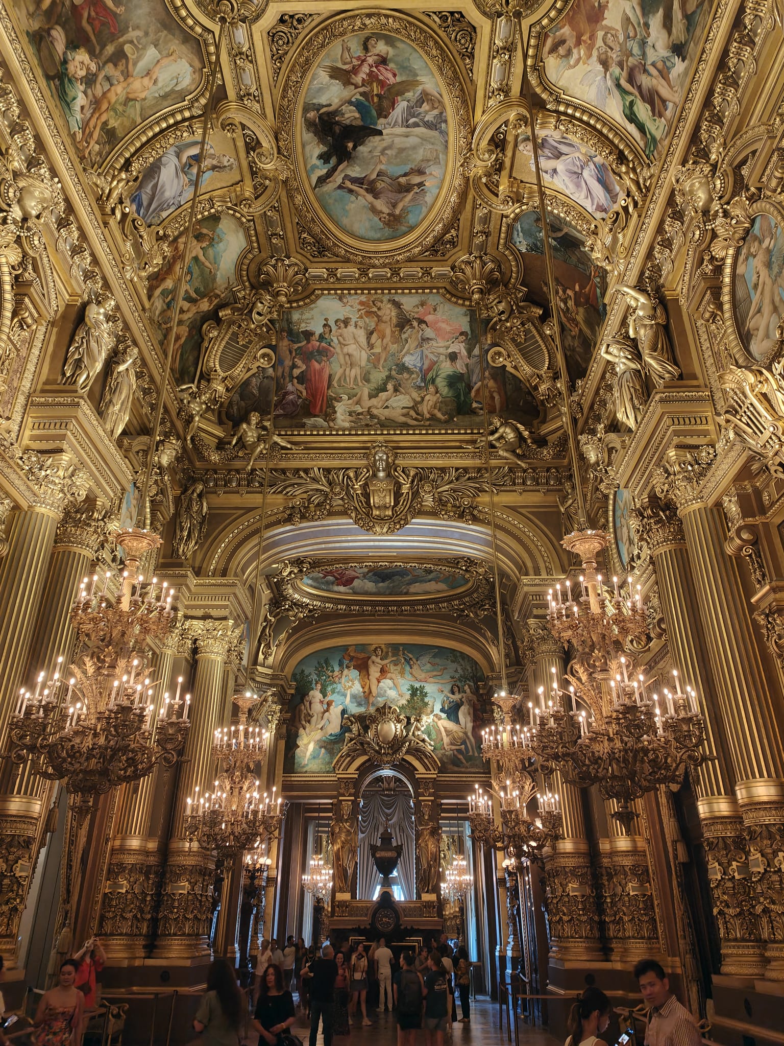 Impressive chandeliers gracefully compliment the beautiful foyer. Practical as well as decorative they hang from an incredible ceiling. The fresco ceiling by Paul Baudry pays homage to the history of music. The central fresco “The Triumph of Apollo” celebrates the god of music and poetry. Gilded decorations and gold adorn the walls, ceiling and columns. Neck ache is compulsory as this room is an architectural masterpiece and embodies the grandeur of the Second Republic.