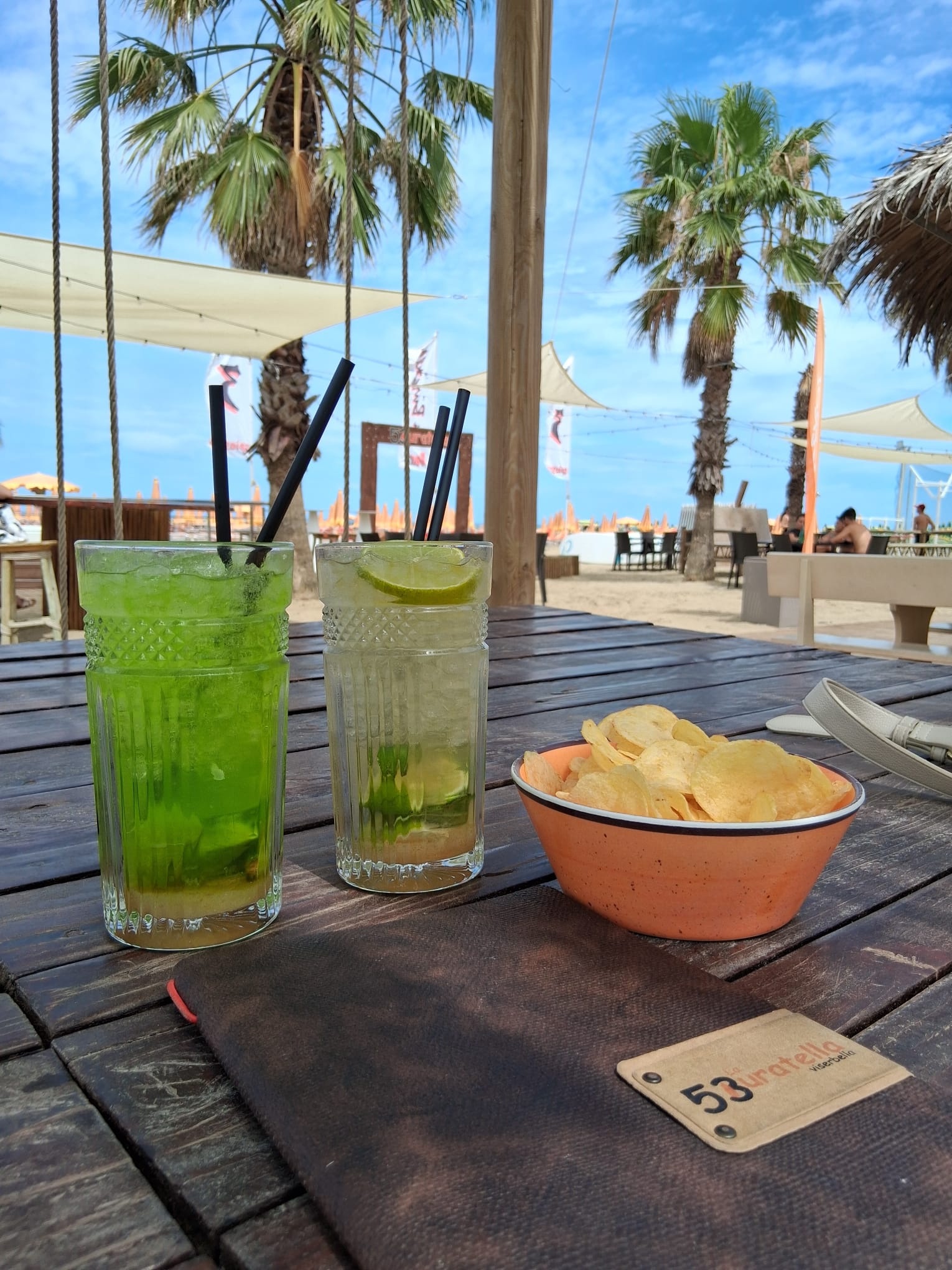 Up above, the cloudless blue skies set the scene for the day ahead as the lonely yet powerful sun beat down and warmed the body. Colourful umbrellas and loungers are lined in military precision along the beaches. There is an eye watering fee commanded for their use, but people must be prepared to pay. Every now and again the line is punctuated by a lonely lifeguard hut.